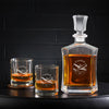 Set includes a distinguished decanter and two matching whiskey rocks glasses, each elegantly engraved with the same personalized design.