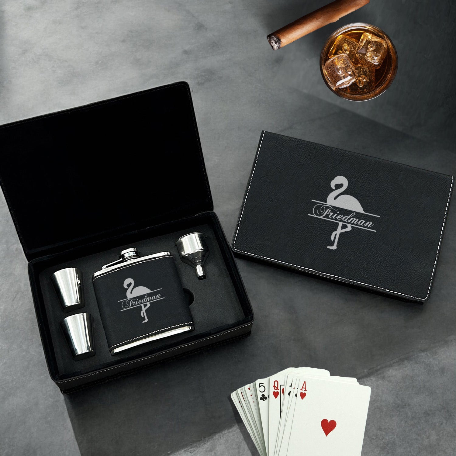 Elevate your gifting game with this customizable stainless steel flask, elegantly encased in leatherette adorned with classic topstitching. Designed to hold 6 oz. of your preferred spirit, it fits seamlessly into your jacket pocket for discreet enjoyment. The secure screw top closure prevents leaks, while the option to personalize the leather casing with a name, date, or message makes it a truly memorable and thoughtful present for any occasion.