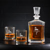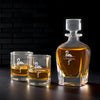 Set includes a distinguished decanter and two matching whiskey rocks glasses, each elegantly engraved with the same personalized design.