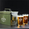 This engraved 50-cal ammo can and two pint beer glass gift set is the ultimate present for any beer enthusiast, combining practicality and personalized touches with high-quality items, all engraved with a custom Fleur De Lis design to add a special touch.