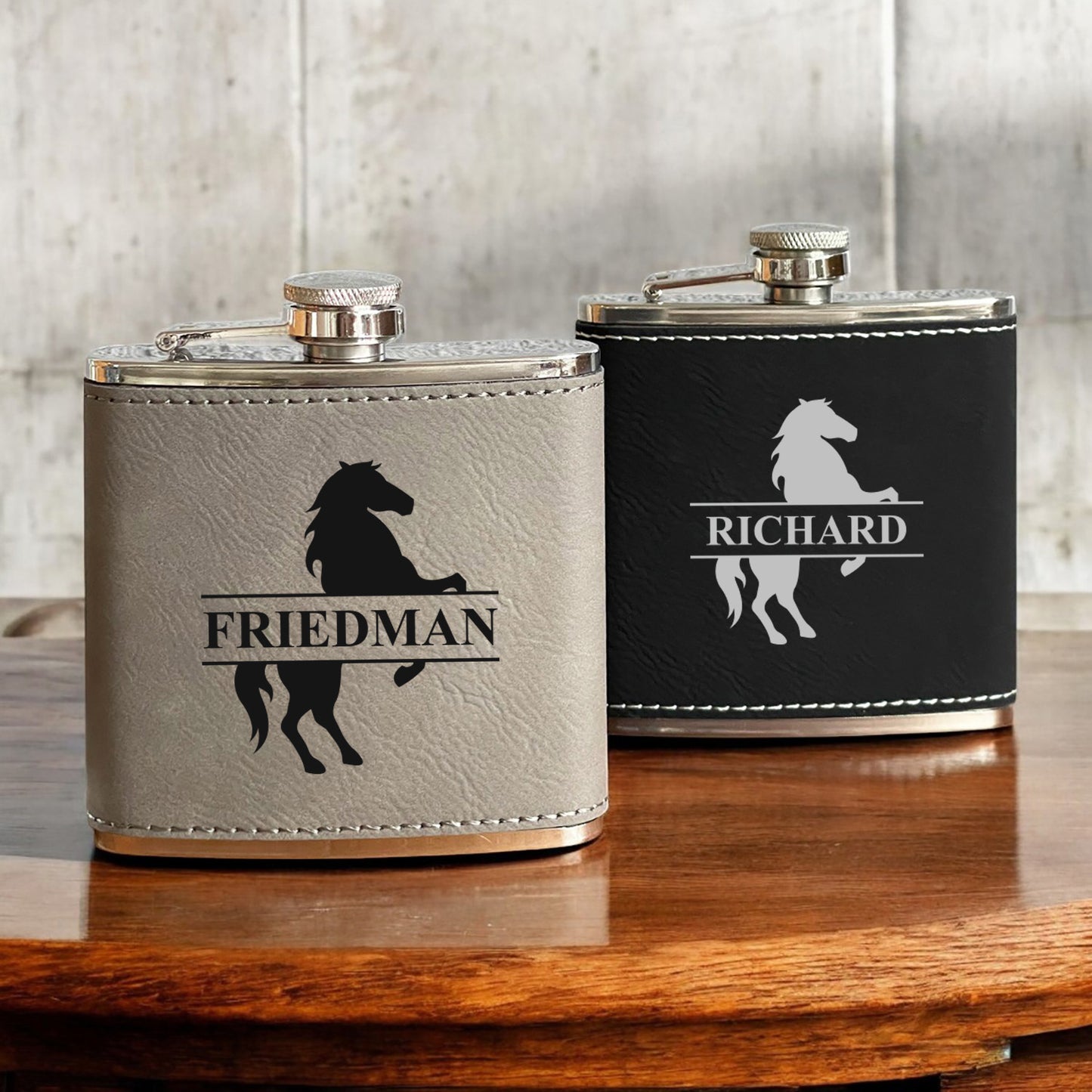 Elevate your sipping experience with our expertly crafted equestrian horse personalized stainless steel and elegantly encased in leather, this flask is not just a vessel; it’s a statement piece. The classic topstitching adds a touch of sophistication, making it the ideal accessory for any occasion.