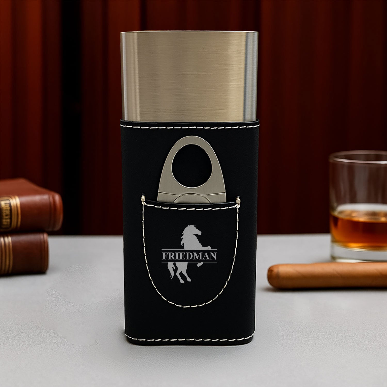 Elevate any cigar lover’s experience with this Equestrian Horse Personalized Travel Cigar Case featuring a built-in stainless steel cutter — a sleek and functional gift that makes every smoke feel special. Designed for convenience and durability, the case securely holds cigars while keeping them fresh wherever life takes you. The integrated cutter fits neatly inside, making it the perfect all-in-one companion for travel, golf outings, or a relaxing night in.