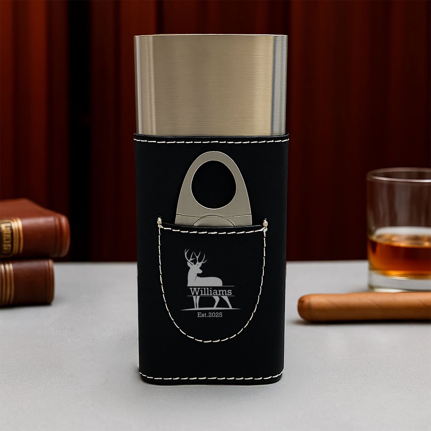 Crafted to hold 2–3 cigars, the case features a durable travel design, engraved personalization (such as a name, initials, or deer/moose graphic), and comes with a precision stainless steel cutter. Ideal for hunting trips, cabin weekends, or relaxing around the campfire.