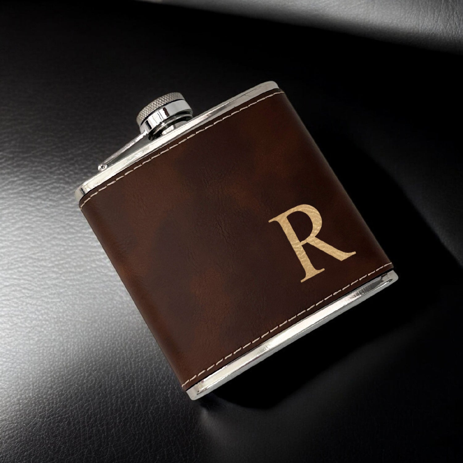 Elevate your sipping experience with our expertly crafted monogram personalized stainless steel and elegantly wrapped in leather, this flask is not just a vessel; it’s a statement piece. The classic topstitching adds a touch of sophistication, making it the ideal accessory for any occasion.