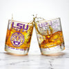 Raise a toast to the Tigers with this officially licensed LSU Whiskey Glass Set. Each set includes two premium 10oz lowball rocks glasses featuring Louisiana State University’s full-color logo alongside an authentic campus map, complete with key landmarks and latitude/longitude lines.