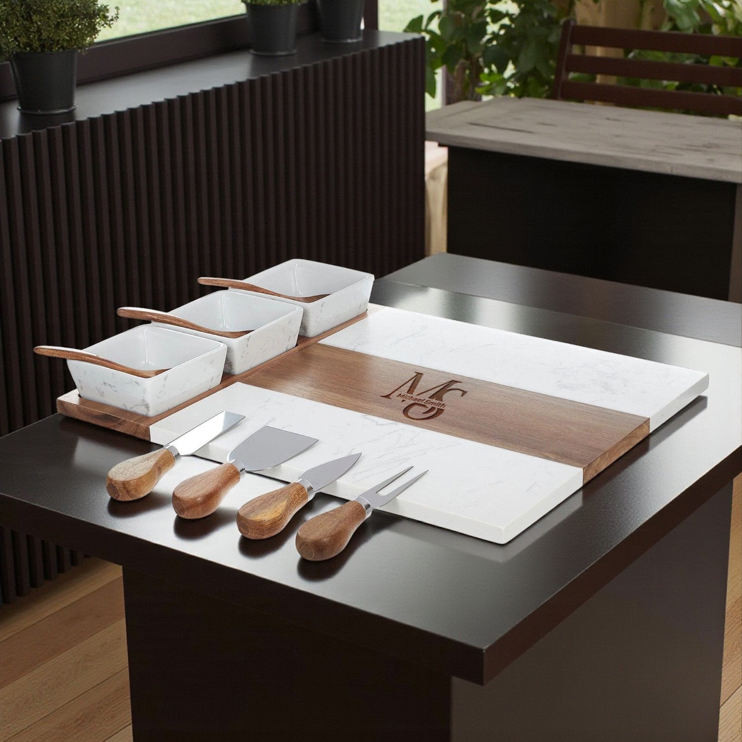 Engraved Wood and Marble Appetizer Serving Platter with 3 Condiment Bowls Serve in style with this personalized wood and marble serving platter — a stunning blend of rustic warmth and modern elegance. The smooth marble surface keeps cheeses cool, while the natural wood adds charm to your presentation. Perfect for charcuterie boards, cheese platters, and appetizer spreads, this engraved serving board comes with three matching condiment bowls for dips, sauces, and garnishes.