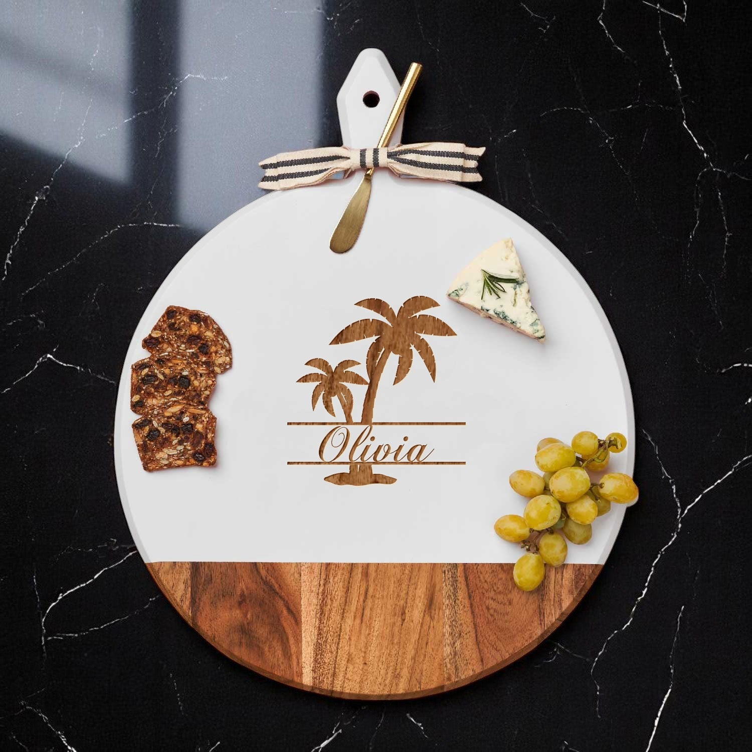 Palm Tree Personalized Round Charcuterie Board with Spreader