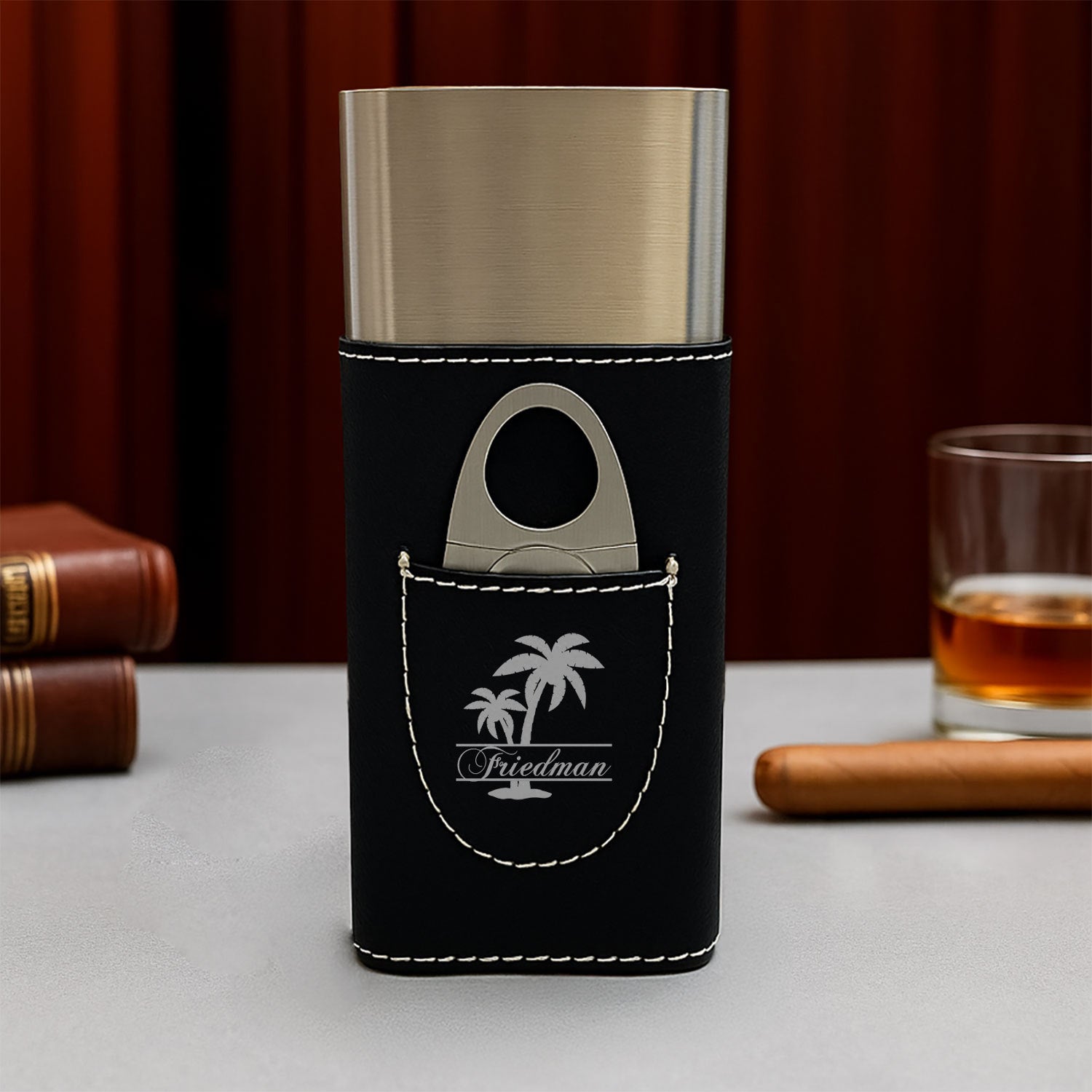 Elevate any cigar lover’s experience with this Palm Tree Personalized Travel Cigar Case featuring a built-in stainless steel cutter — a sleek and functional gift that makes every smoke feel special. Designed for convenience and durability, the case securely holds cigars while keeping them fresh wherever life takes you. The integrated cutter fits neatly inside, making it the perfect all-in-one companion for travel, golf outings, or a relaxing night in.