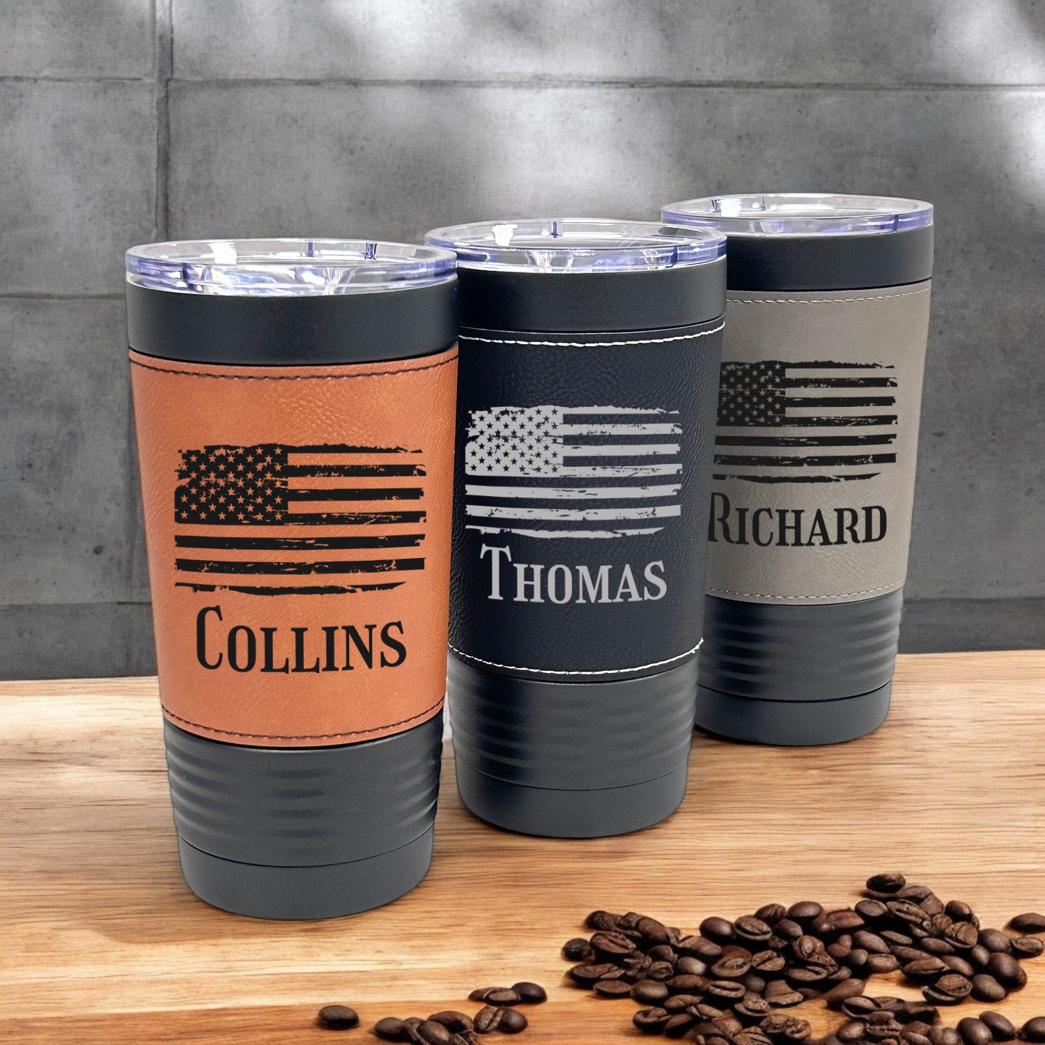 This Patriotic black 20 oz leather wrapped tumbler combines practicality with elegance, making it an ideal gift for various occasions such as birthdays, weddings, retirements, and anniversaries. Its double-wall, vacuum-insulated design ensures beverages maintain their temperature, while the sophisticated leather wrap enhances its aesthetic appeal, making it a memorable and stylish choice for anyone looking to celebrate a special moment.
