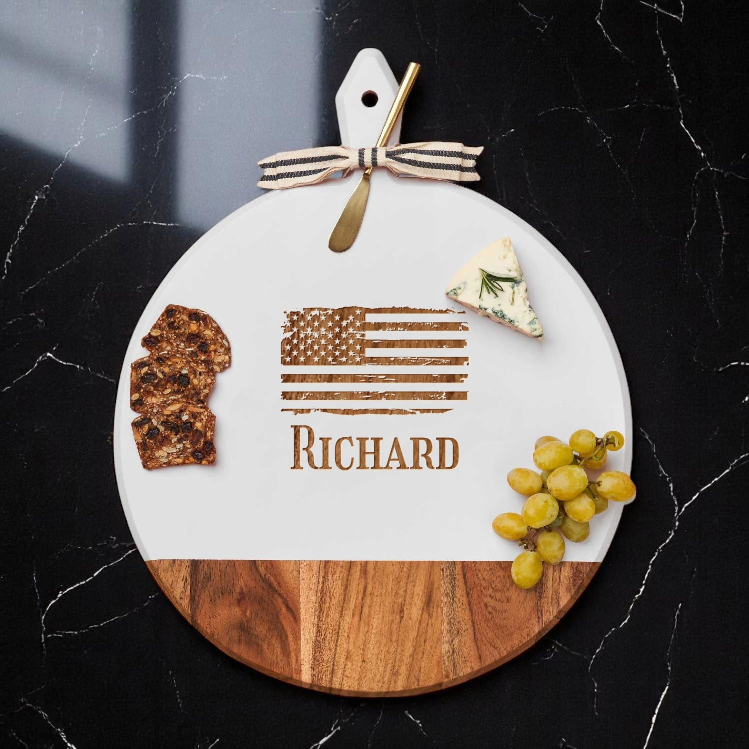 This personalized acacia wood round charcuterie board with gold brass spreader and decorative ribbon is an ideal gift for gatherings, housewarmings, birthdays, or co-worker celebrations, combining elegance and functionality. Crafted from durable, beautiful acacia wood, it offers a stylish surface for cheeses, meats, and accompaniments, while the personalized engraving adds a special touch, making it a thoughtful and unique present. Perfect for entertaining and memorable occasions, this customized board is both practical and decorative, elevating any social event.