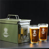 This engraved 50-cal ammo can and two pint beer glass gift set is the ultimate present for any beer enthusiast, combining practicality and personalized touches with high-quality items, all engraved with a custom design to add a special touch.