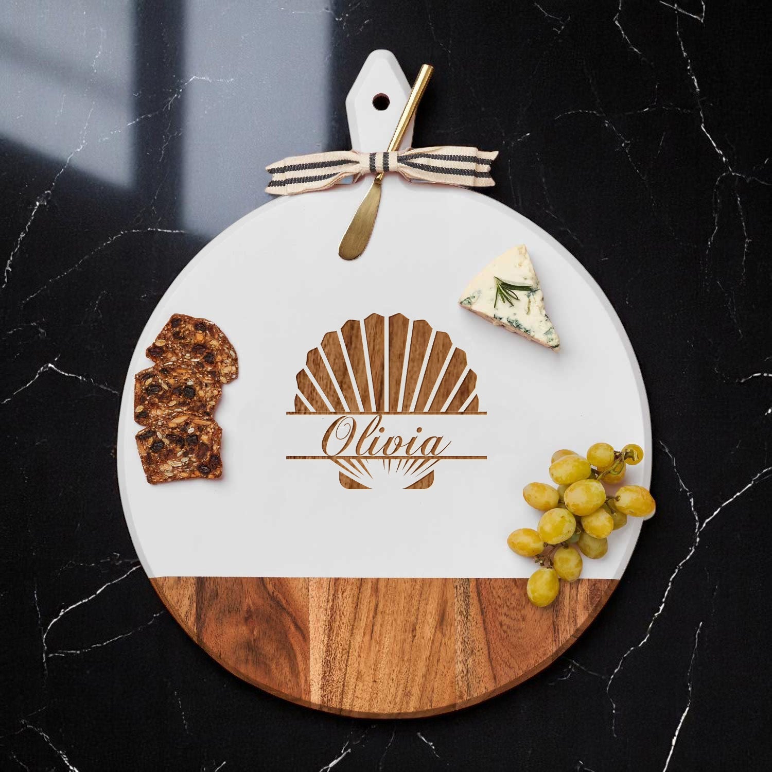 This personalized acacia wood round charcuterie board with gold brass spreader and decorative ribbon is an ideal gift for gatherings, housewarmings, birthdays, or co-worker celebrations, combining elegance and functionality. Crafted from durable, beautiful acacia wood, it offers a stylish surface for cheeses, meats, and accompaniments, while the personalized engraving adds a special touch, making it a thoughtful and unique present. Perfect for entertaining and memorable occasions, this customized board is both practical and decorative, elevating any social event.