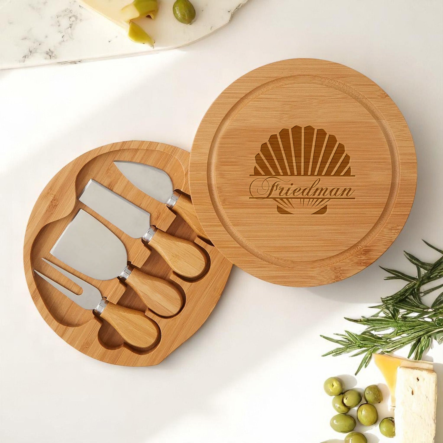 Celebrate coastal elegance with our Seashell Personalized Swivel Cheese Board Gift Set. Crafted from rubberwood, it features a swivel drawer that reveals four stainless steel cheese tools for effortless entertaining.