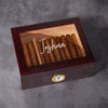 The Cigar Humidor 50 Count is a sophisticated and functional storage solution for cigar enthusiasts who value both preservation and presentation. Crafted with a sleek black painted finish, it features a premium glass top with an intricately etched design, allowing for engraved personalization. The interior is lined with high-quality Spanish cedar to maintain optimal humidity, while an adjustable divider helps organize your collection. A built-in gold-trimmed hygrometer, internal locking hinges, and a secure humidifier ensure your cigars stay fresh and well-maintained, making this humidor an excellent gift for any cigar aficionado.