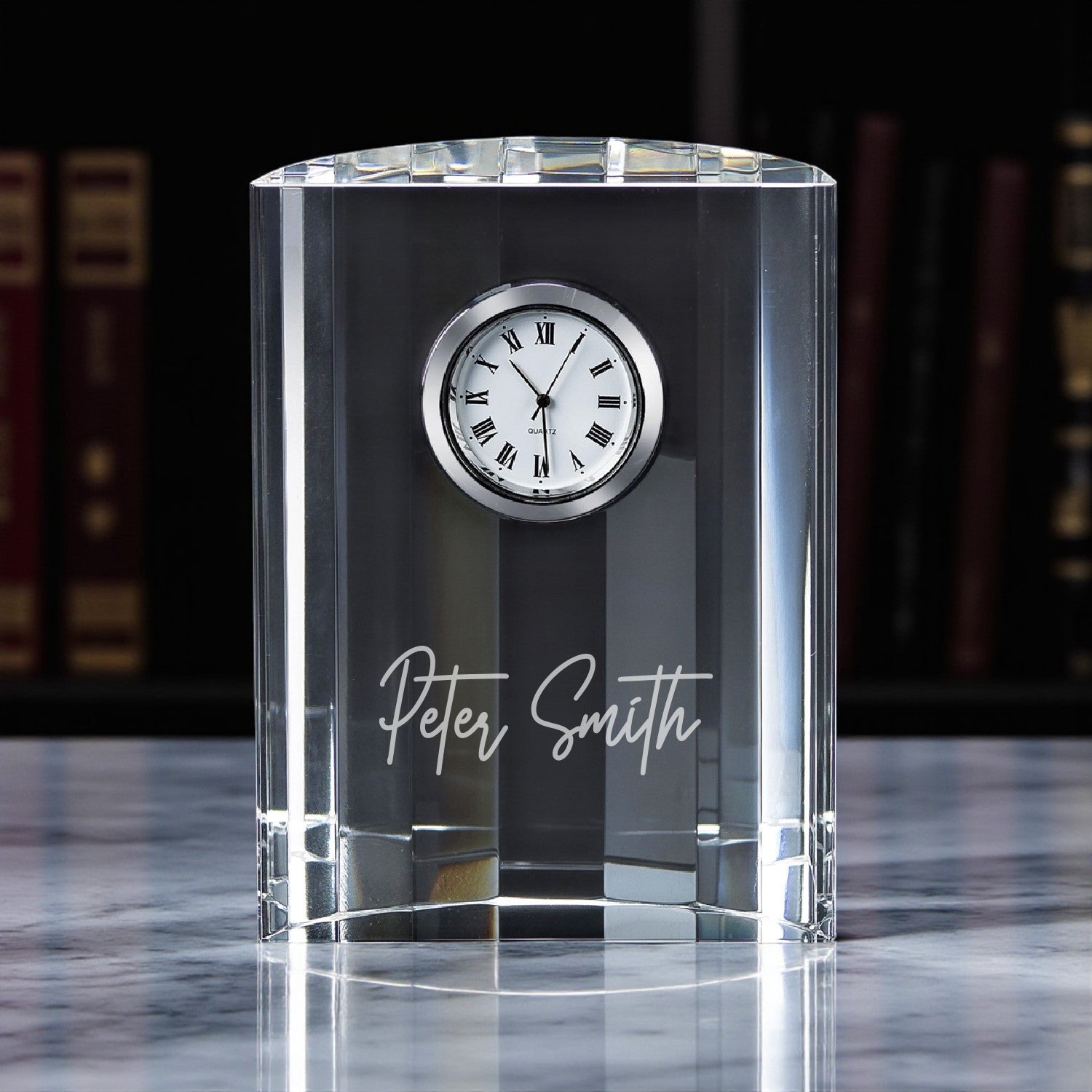 Signature Personalized Optic Crystal Desk Clock is timeless piece of craftsmanship and clarity. Standing 4.5 inches tall by 3.25 inches wide, this semi-circular clock is crafted from premium, lead-free optic crystal—brilliantly clear, weighty in hand, and ideal for precision laser engraving.